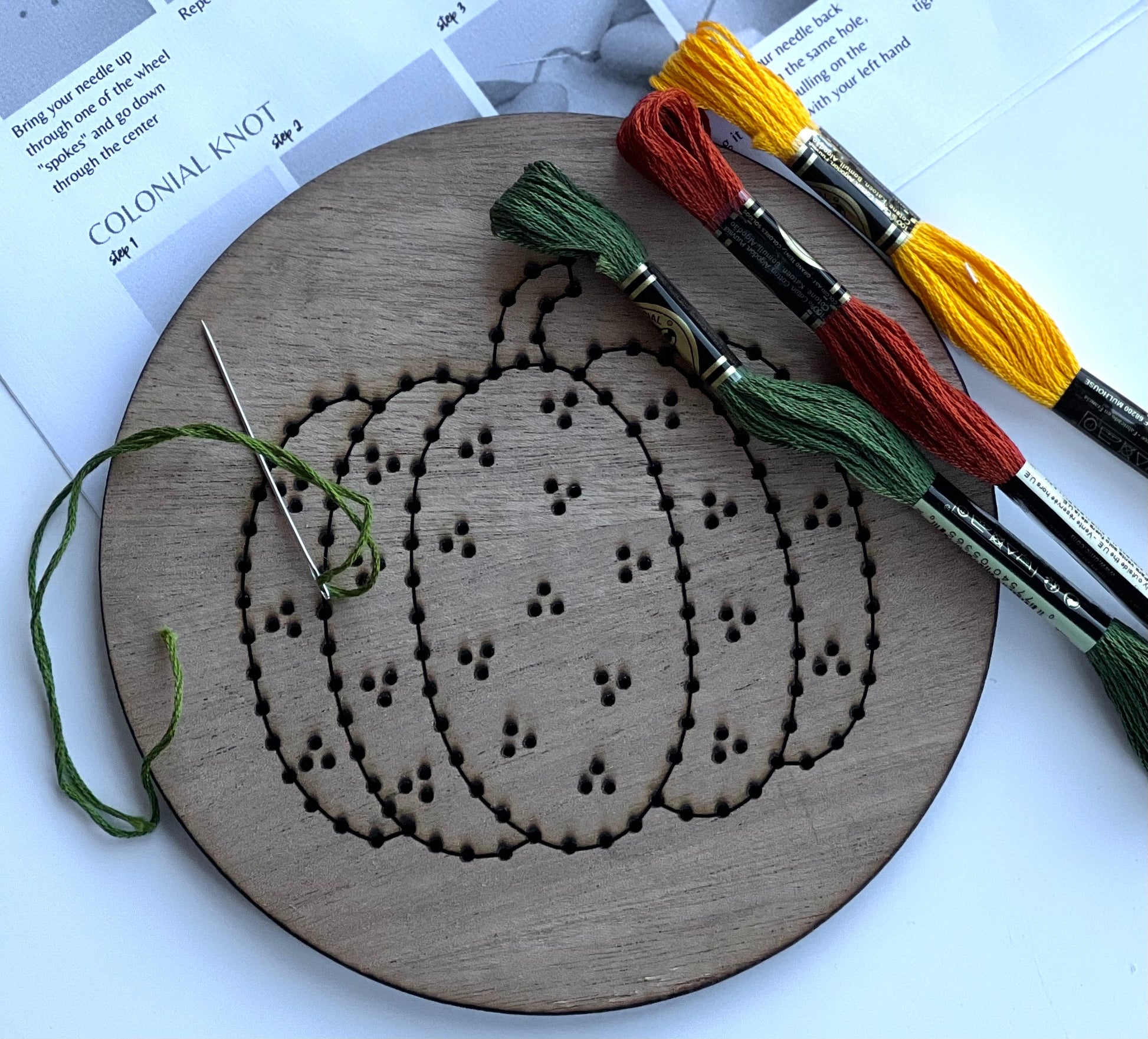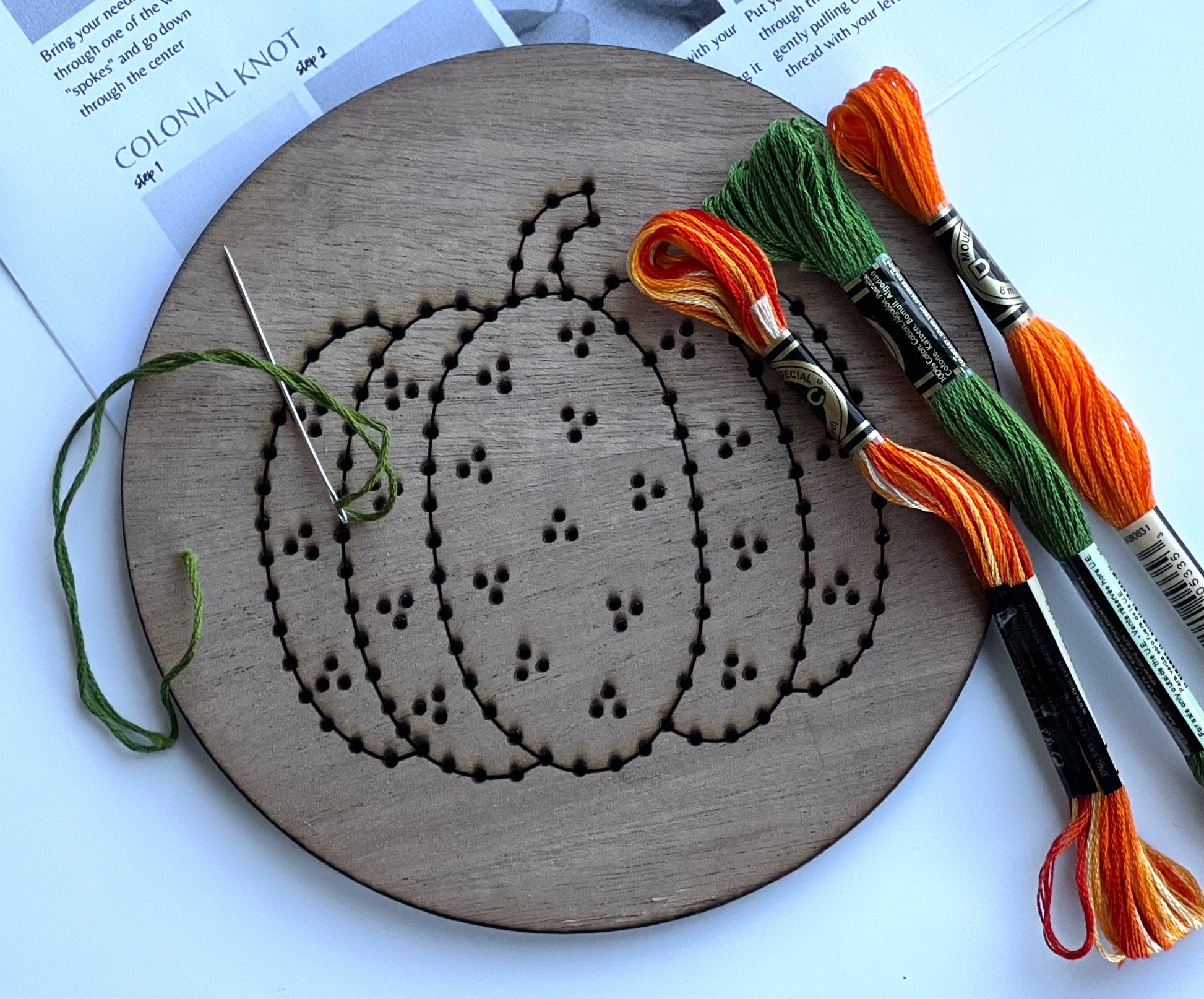 Simple lines with berries on this pumpkin. Round is 6" and comes unfinished with instructions and 3 skeins of floss. Option for no thread is available.